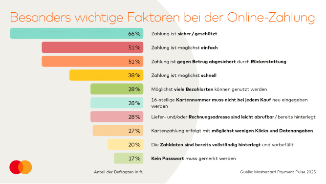 Beim Online-Bezahlen wünschen sich deutsche Konsument:innen vor allem ein hohes Sicherheitsniveau (66 %), gefolgt von einer einfachen (51 %) und schnellen Abwicklung (38 %). Rund die Hälfte (51 %) legt Wert darauf, dass Zahlungen gegen Betrug abgesichert sind und im Schadensfall eine Rückerstattung erfolgt – solange keine grobe Fahrlässigkeit vorliegt. Etwa ein Viertel der Befragten (28 %) möchte mehrere Bezahlarten nutzen können, die 16-stellige Kartennummer nicht bei jedem Kauf neu eingeben müssen und die Liefer- bzw. Rechnungsadresse leicht abrufen oder hinterlegen können. Mehr als jede:r Vierte wünscht sich zudem möglichst wenige Klicks und Dateneingaben beim Bezahlen (27 %).