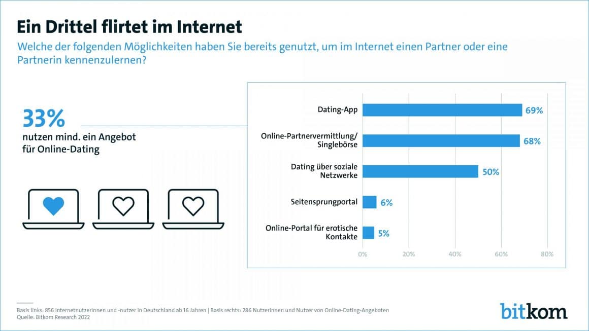 Swipen, scrollen, klicken: Für den Online-Flirt nutzen die Menschen unterschiedliche Angebote. Die Hälfte (50 Prozent) der Nutzerinnen und Nutzer von Online-Dating-Diensten flirtet in sozialen Netzwerken. Unter den Männern nutzen 54 Prozent Instagram, Facebook und Co. auf der Suche nach Dates, 45 Prozent sind es bei den Frauen. Die meisten haben jedoch ein Profil in Dating-Apps: 7 von 10 (69 Prozent) wischen auf Tinder, Lovoo oder Bumble nach links und rechts. Etwa genauso viele (68 Prozent) sind auf Online-Singlebörsen oder bei Partnervermittlungen wie Parship, ElitePartner oder eDarling unterwegs.