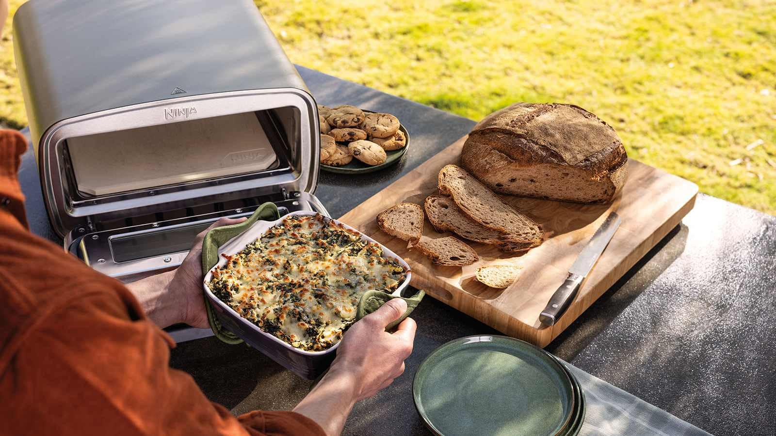 Ebenfalls ganz oben auf der Agenda der Befragten: multifunktionale Nutzung. Der Ninja Artisan Outdoor-Elektro-Pizzaofen und Heißluftfritteuse beispielsweise ist ein vielseitiges 4-in-1-Multitalent für die Outdoor-Küche. Der Alleskönner backt, heißluftfrittiert, lässt Teig gehen und zaubert in nur drei Minuten handgemachte Pizzen in Restaurantqualität. Dank präziser Temperaturregelung bis 370°C und der Complete Temperature Control Technologie gelingen perfekte Ergebnisse ohne ständiges Eingreifen oder offene Flamme. Das Gerät bietet zudem eine Heißluftfrittier-Funktion für knusprige Beilagen und ein Chef’s View Fenster zur Überwachung.