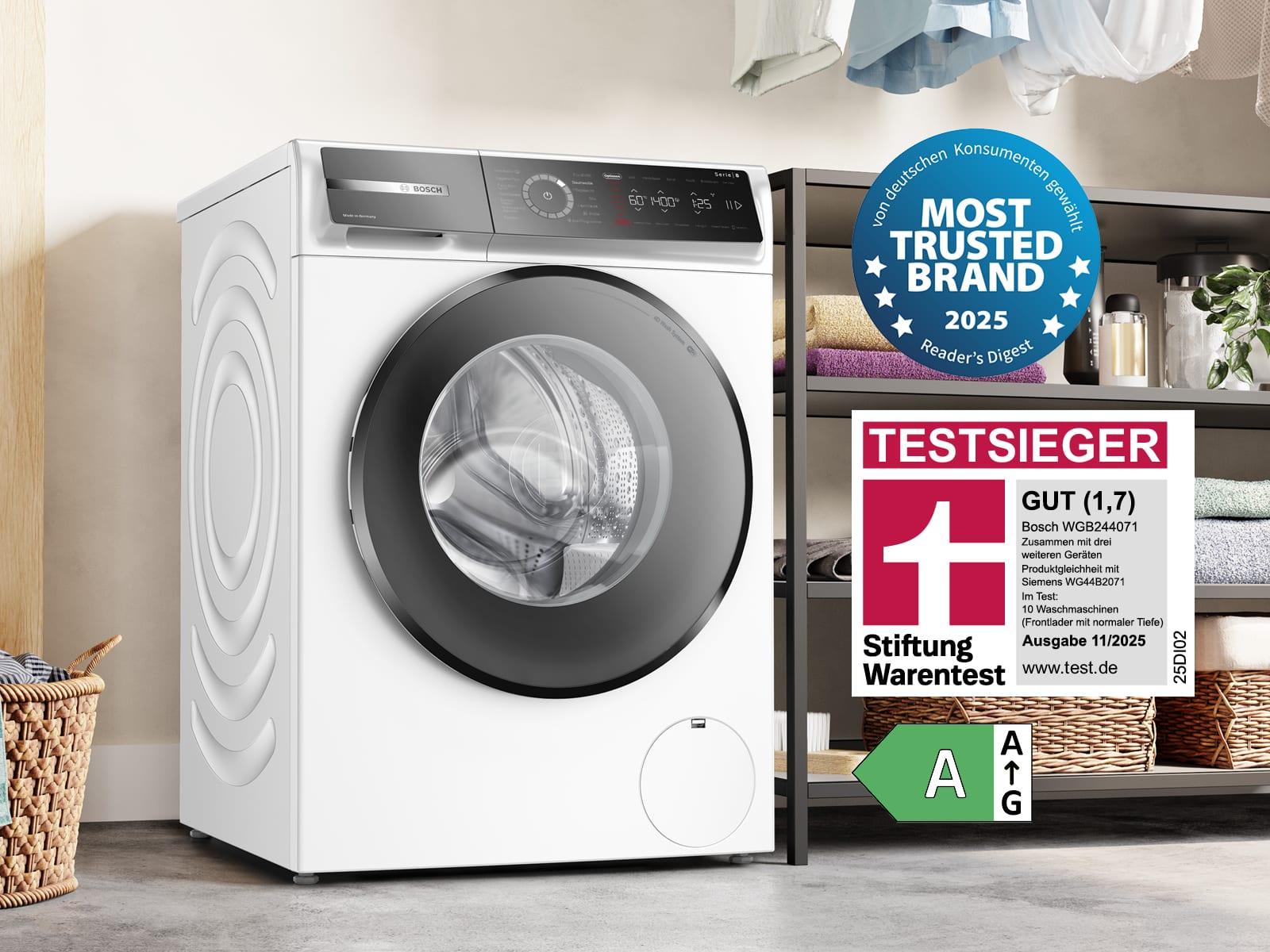 Im aktuellen Waschmaschinentest der Stiftung Warentest sichern sich die Modelle WGB244071 (Serie 8) und WUU28T71 (Serie 6) von Bosch mit der Gesamtnote „Gut (1,7)“ den ersten Platz unter den Frontladern mit normaler Tiefe. Besonders überzeugen konnten die Geräte in den Kategorien Waschwirkung, Umwelteigenschaften sowie Schutz vor Wasserschäden. Erstmals wurde auch die Reparierbarkeit bewertet – hier erreichte die WUU28T71 die Note „Gut (2,0)“.