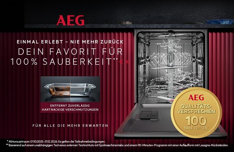 Mit dem „AEG Qualitätsversprechen“ setzt die Premiummarke ein starkes Zeichen für Vertrauen in die eigene Produktqualität. Im Rahmen der Aktion profitieren Käufer eines Geschirrspüler-Modells der neuen AEG FAVORIT Serien 8000 und 9000 in Deutschland und Österreich von einem erweiterten Rückgabezeitraum von 100 Tagen. So können sie die Geräte im Alltag ausgiebig testen und sich selbst von Leistung, Komfort und Design überzeugen. Die Aktion läuft ab sofort bis 31. Dezember 2026 bei allen teilnehmenden Handelspartnern im Elektro- und Möbelfachhandel sowie im direkten Online-Vertrieb.