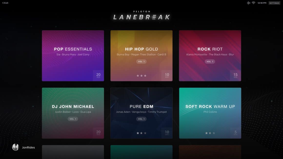 Lanebreak ist ein musikbasiertes und spielerisches Ride-Erlebnis, bei dem die Mitglieder ihren Widerstand oder ihre Trittgeschwindigkeit gemäß animierter Hinweise auf dem Bildschirm befolgen müssen, um die höchstmögliche Punktzahl zu erreichen – und das im Rhythmus der Musik.
