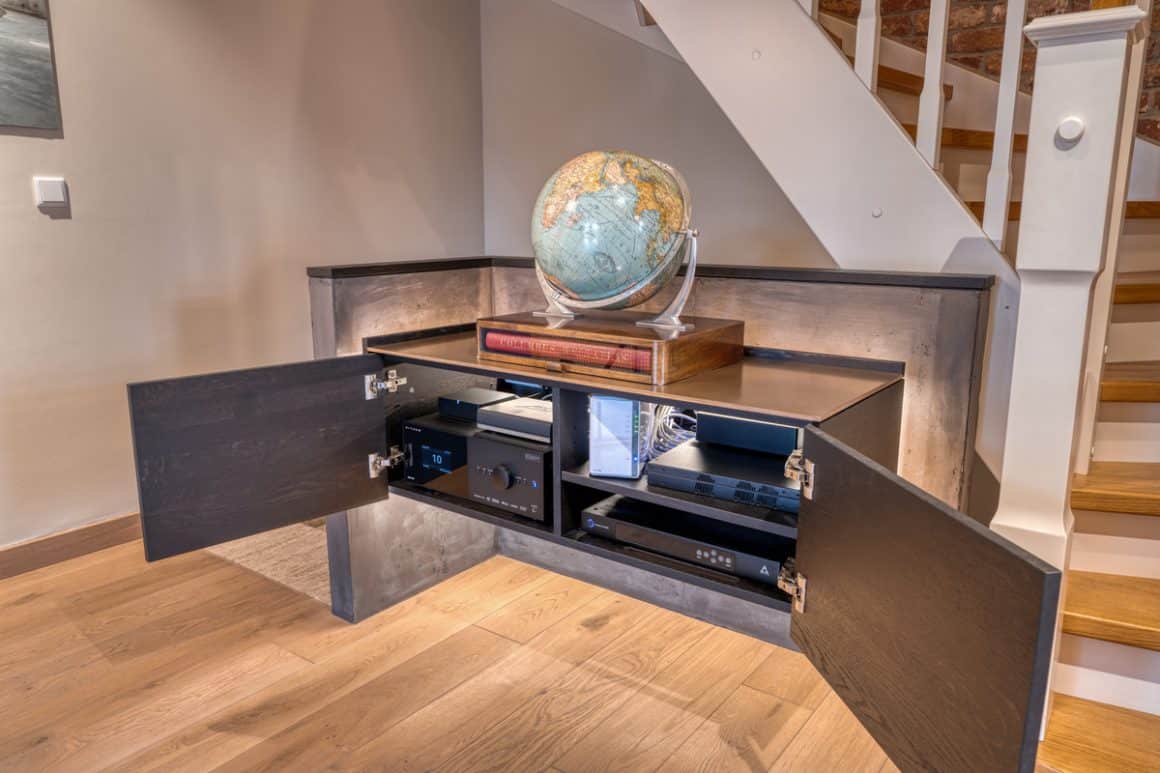 Auch wenn keine Geräte sichtbar sind, ist die bequeme und problemlose Bedienung gewährleistet. Dafür sorgt eine RTI-Steuerung, die über das Netzwerk den Zugriff auf alle Funktionen erlaubt.