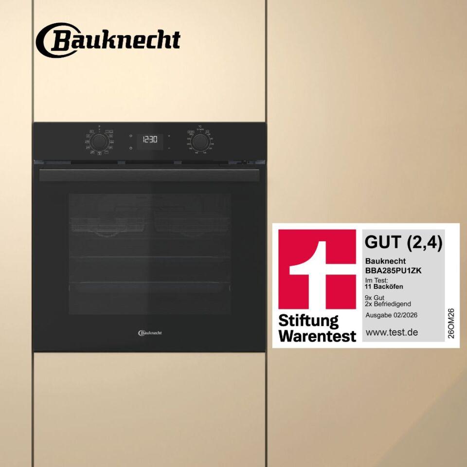 Der Einbau-Backofen BBA285PU1ZK von Bauknecht wurde von Stiftung Warentest mit dem Qualitätsurteil „Gut (2,4)” ausgezeichnet und erzielte insbesondere im Bereich Sicherheit die Bestnote „Sehr gut“. Positiv bewertet wurden zudem die gleichmäßige Wärmeverteilung beim Backen mit Ober-/Unterhitze und Heißluft sowie die zuverlässige Einhaltung von Temperatur und Garzeit. Der Backofen verfügt über einen 71 Liter großen Garraum, mehrere Beheizungsarten und bietet Funktionen für das gleichzeitige Garen auf mehreren Ebenen.
