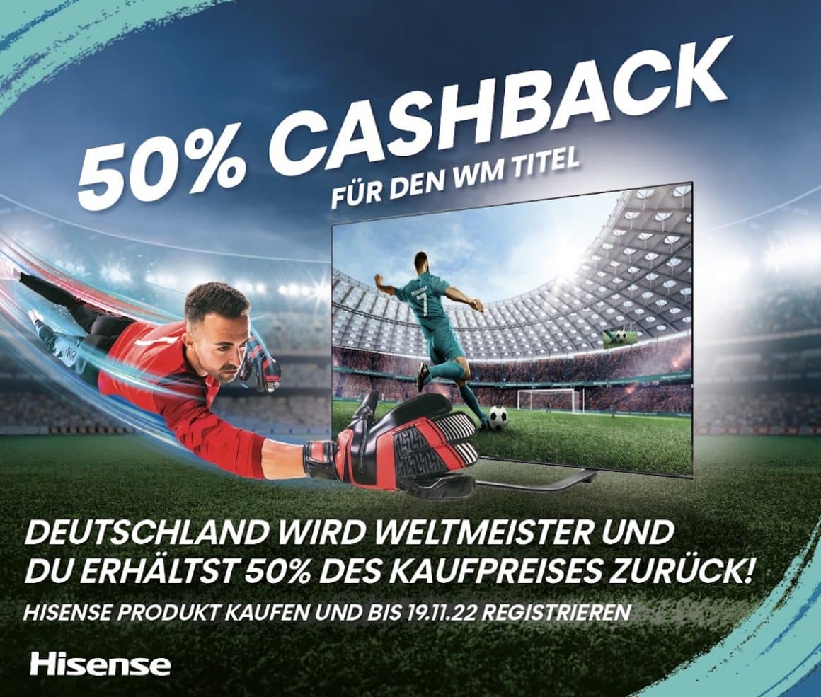 Noch mehr Qualität gibt es für alle, die sich den Hisense U7H ULED vor dem 19. November 2022 sichern und sich für eine spektakuläre Cashback-Aktion online registrieren. Holt sich Deutschland den WM-Pokal erhält man 50 Prozent des Kaufpreises zurück.